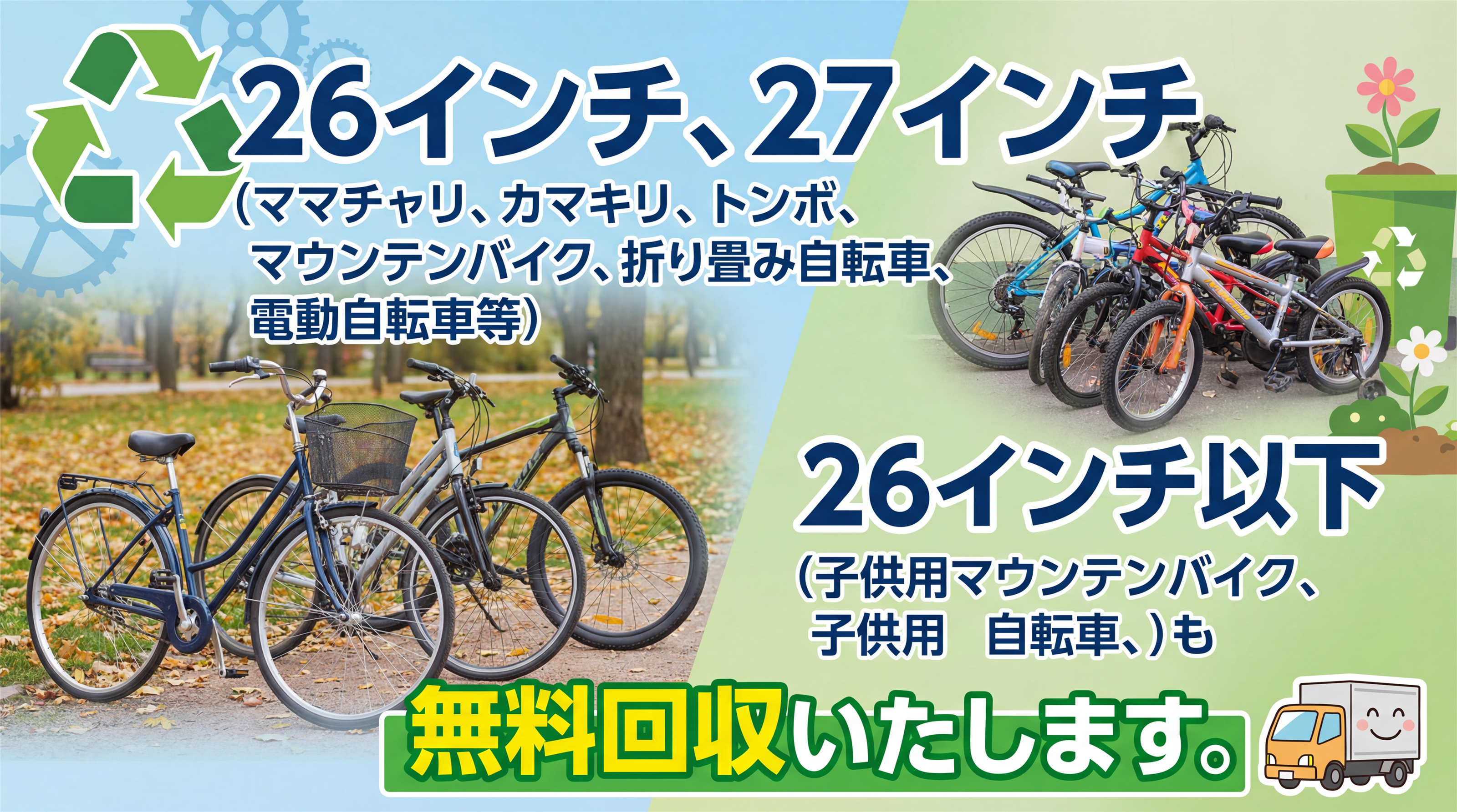 また、26インチ以下の子供用マウンテンバイクや子供用自転車なども無料で回収しております。